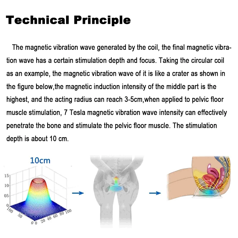 Bobin tarafından üretilen manyetik titreşim dalgaları, aşırı eğitim için pelvik taban kaslarını kontrol etmek için motor sinirlerini uyarır, tekrarlanan hiper kasılmalar üretmek için pelvik taban kaslarını uyarır, Böylece pelvik taban kas dokusunu aktive etmek ve kas kontrol kabiliyetini arttırmak, kan dolaşımını teşvik etmek ve sertliği geri yüklemek, esnekliği artırmak için pelvik taban kaslarını etkili bir şekilde iyileştirmek için kas liflerinin sayısını arttırmak, ve pelvik taban kaslarının işlevini geliştirin.