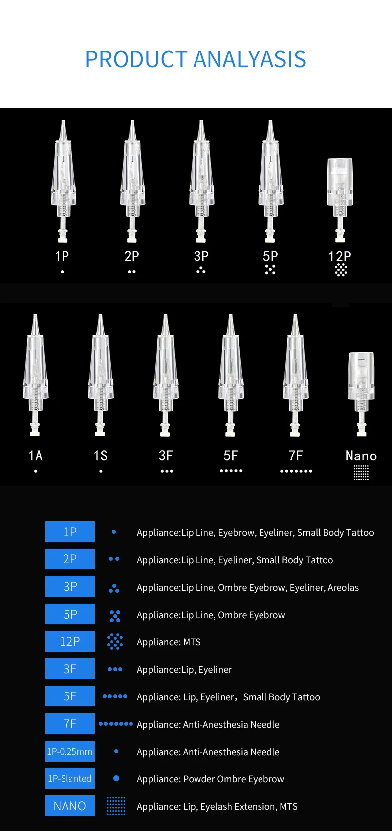 Iğne dayanıklıdır ve ayrıca altın kaplama uygulayarak yüksek biyouyumluluk vardır. Metal alerjisi olan hasta da kontakt dermatit ile ilgili değil. 5. Hassas derinlik kontrolü. 0.5 ~ 5.0mm [0.1mm adım]